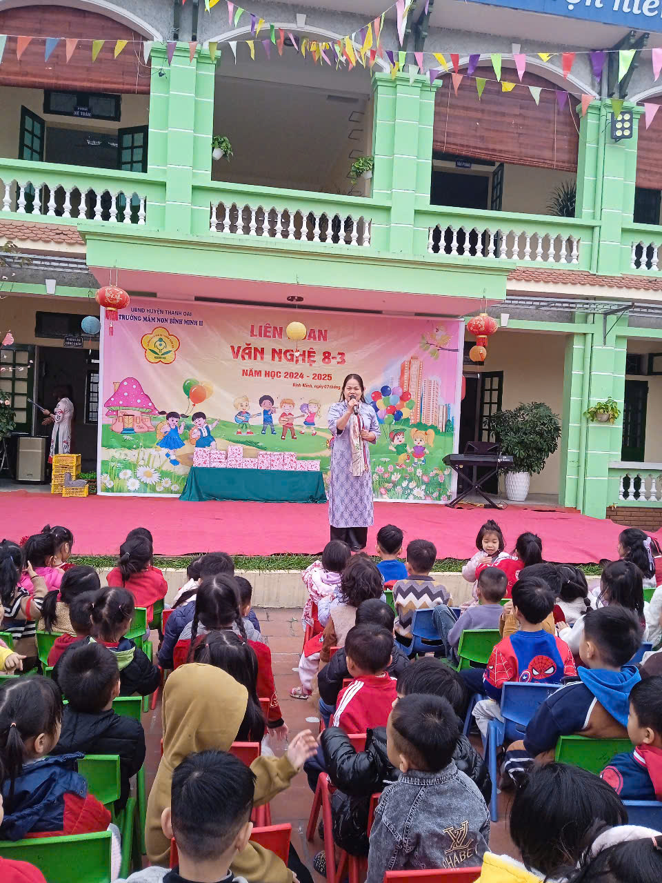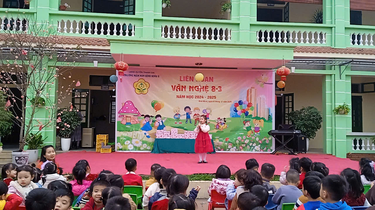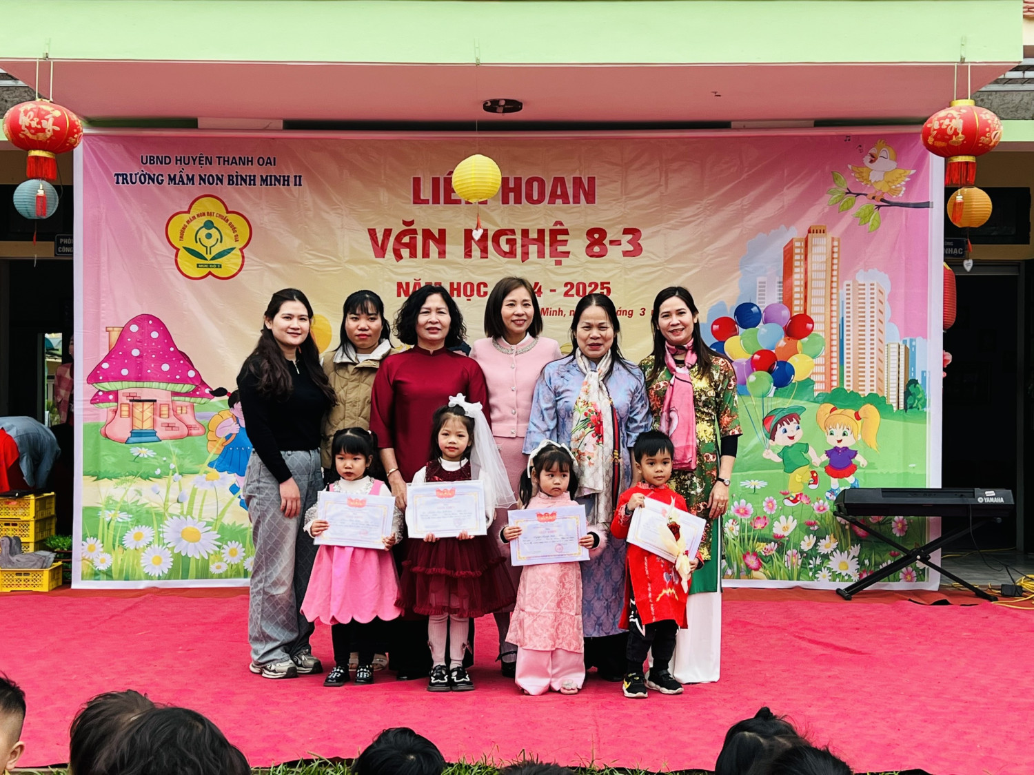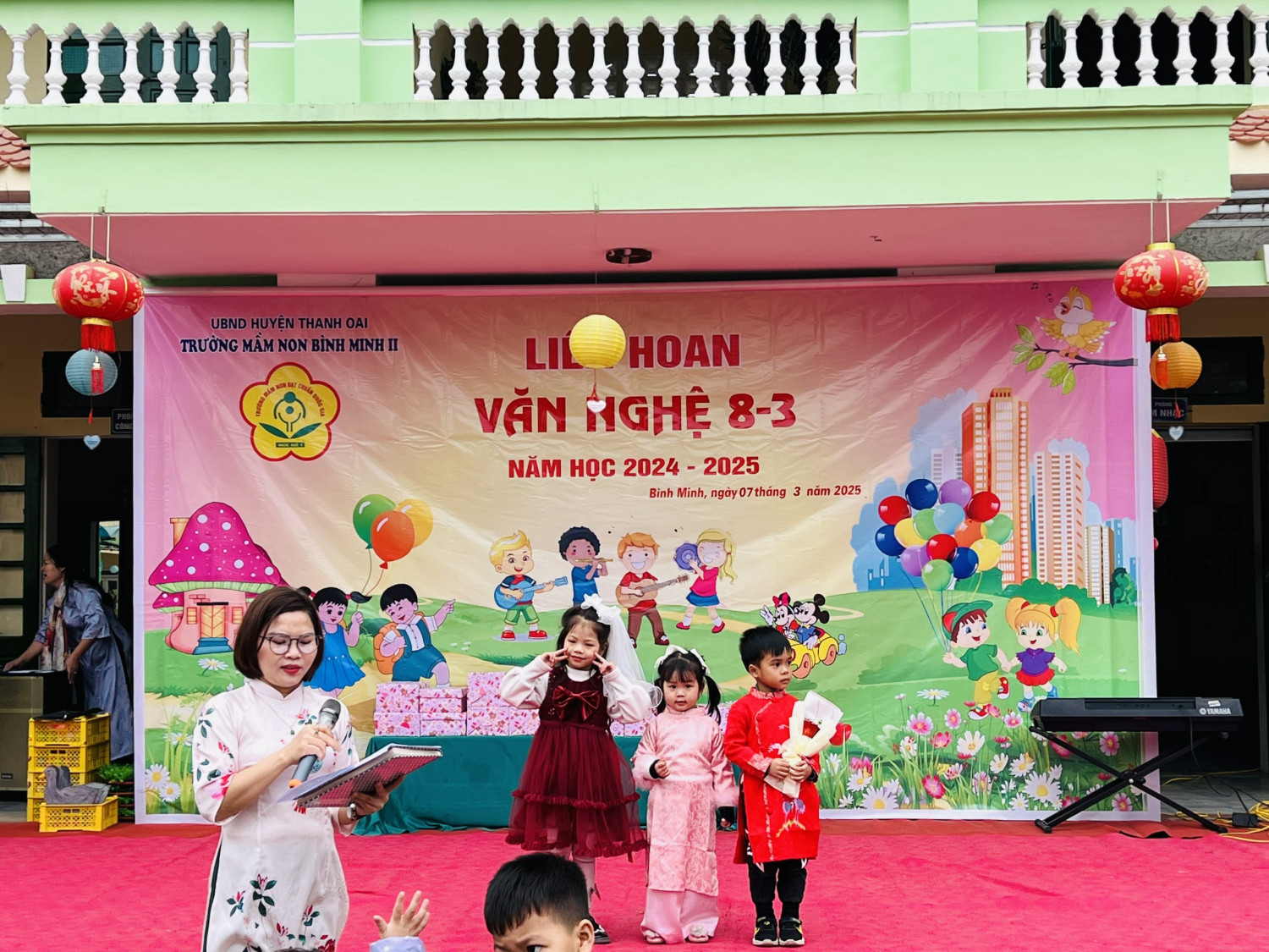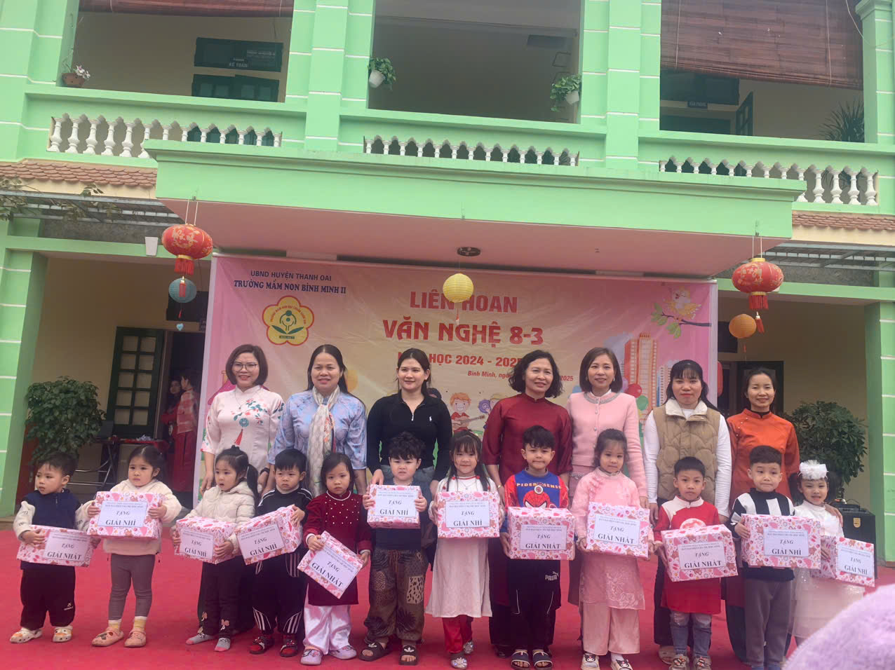 Nhân dịp kỉ niệm 115 năm ngày quốc tế phụ nữ 8/3 (8/3/1910 - 8/3/2025) và 1985 năm Khởi nghĩa Hai Bà Trưng và mong muốn các bé trường mầm non Bình Minh II tỏ lòng biết ơn của con dành cho bà, cho mẹ, cho cô. Cảm ơn những hy sinh thầm lặng và tình yêu vô điều kiện của các mẹ. Trường mầm non tổ chức 1 số hoạt động như: hội thi online “Hát múa tặng bà và mẹ nhân ngày quốc tế phụ nữ 8/3” trong 5 ngày từ 01/3 đến hết 05/3, làm thiệp tặng bà và mẹ, kỹ năng sống tri ân về mẹ, trò chơi vịt đẻ trứng, tiệc buffe, tuần lễ áo dài cho cô và trẻ, liên hoan gặp mặt các chàng dể của trường…. và sáng nay ngày mùng 5 và mùng 7 tháng 3 năm 2025 nhà trường tổ chức liên hoan văn nghệ và công diễn các tiết mục được giải cao.