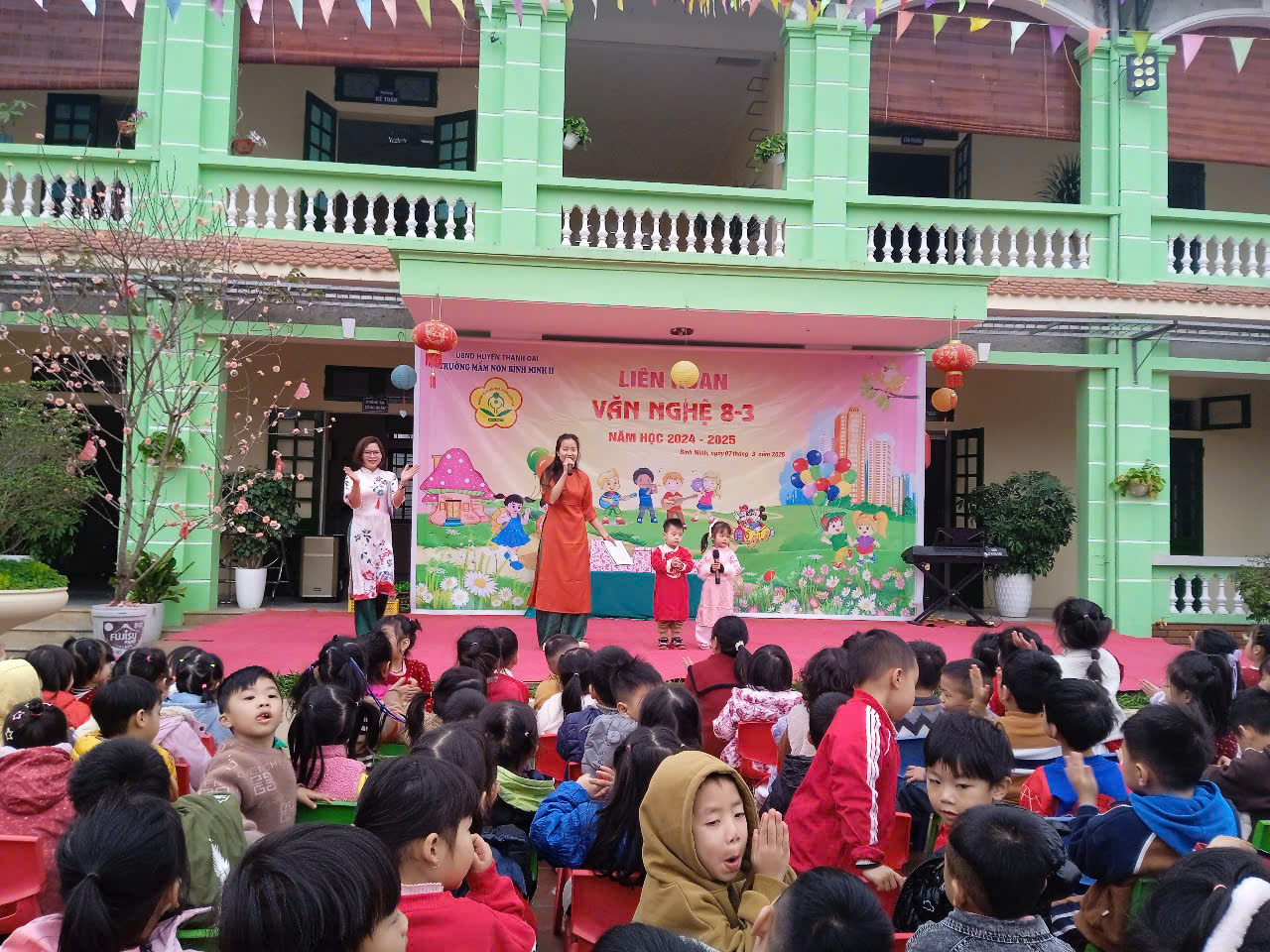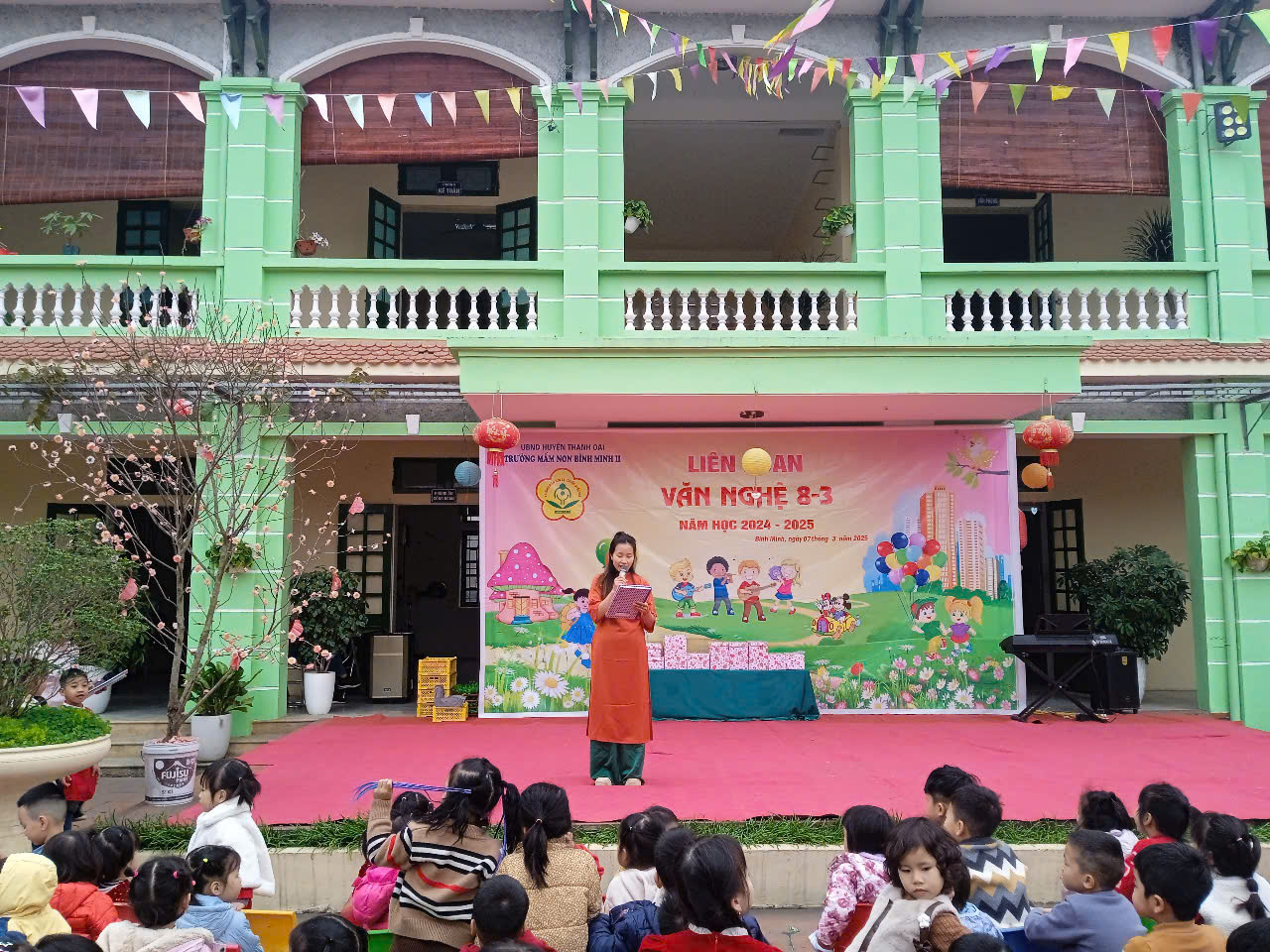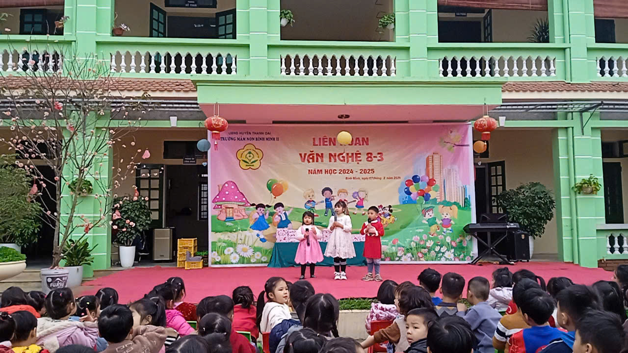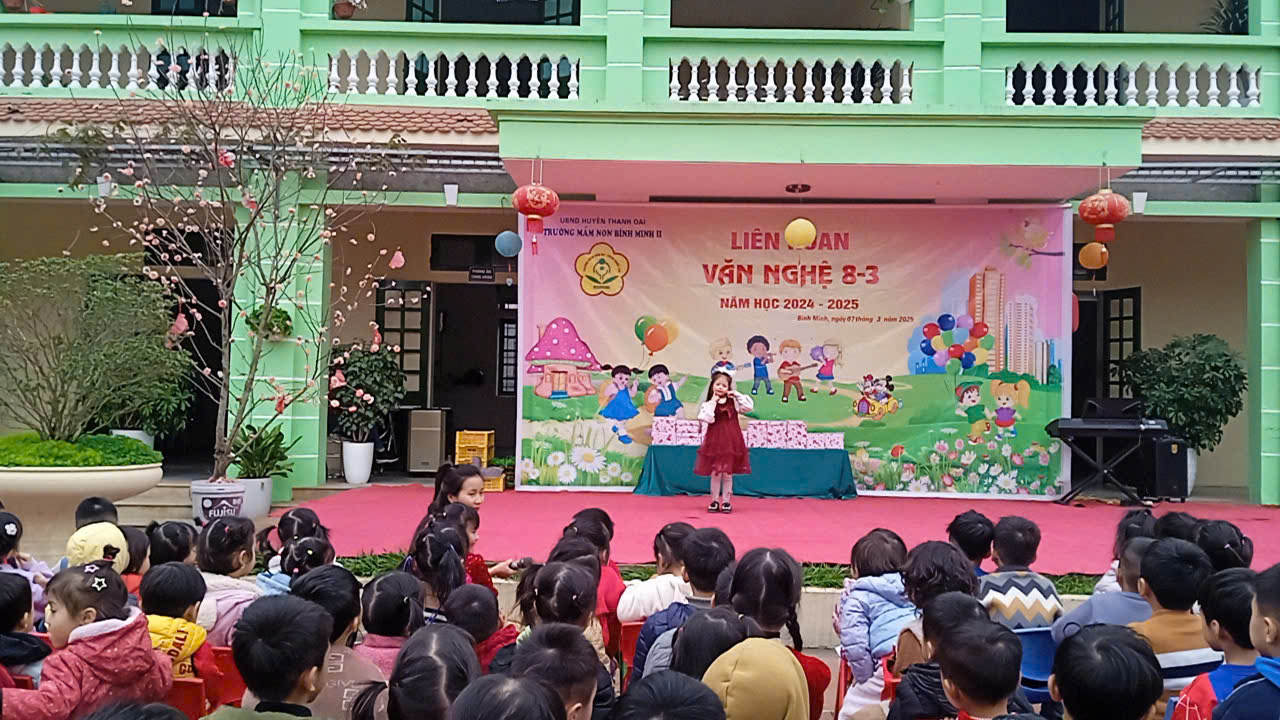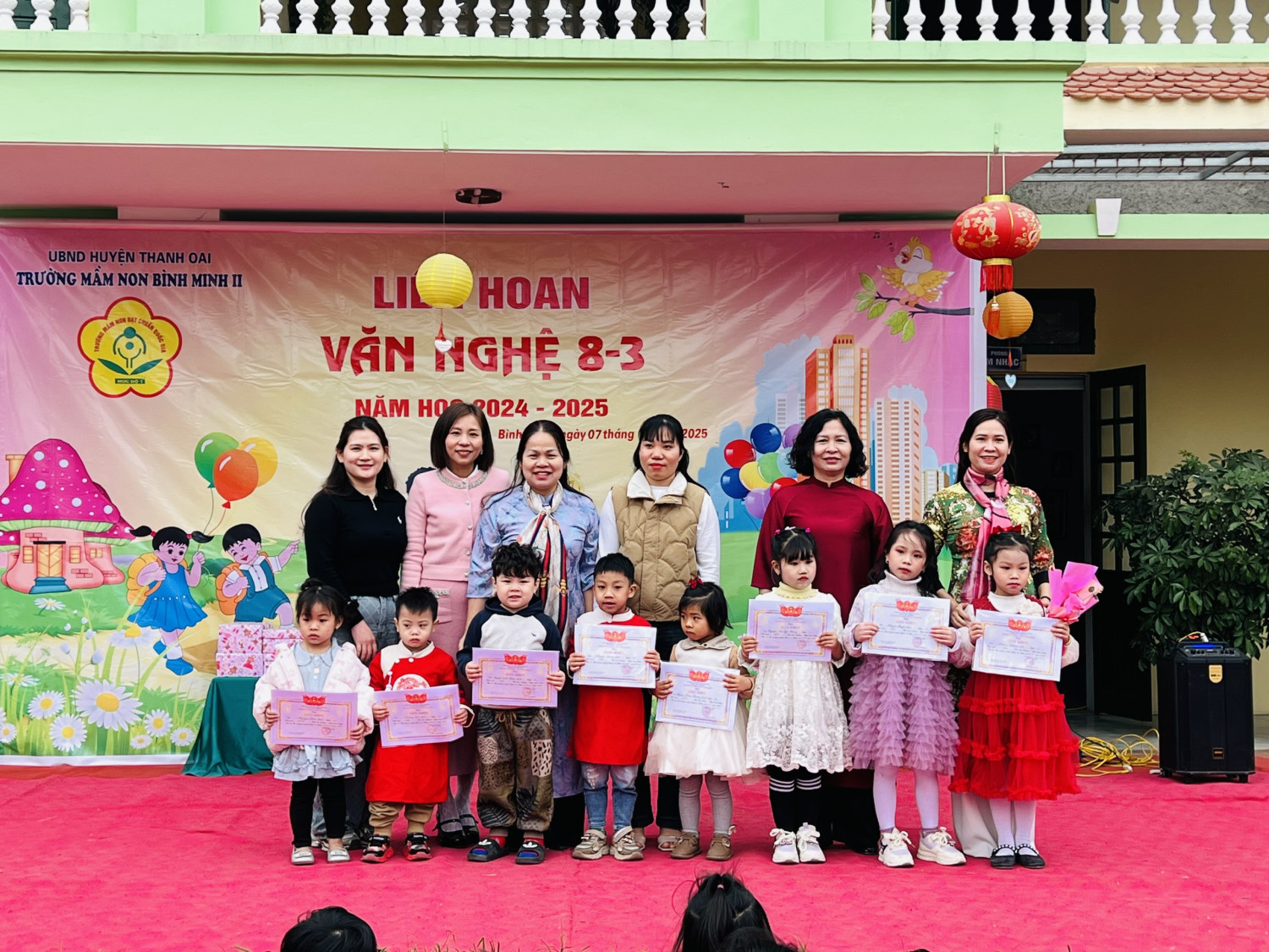 Nhân dịp kỉ niệm 115 năm ngày quốc tế phụ nữ 8/3 (8/3/1910 - 8/3/2025) và 1985 năm Khởi nghĩa Hai Bà Trưng và mong muốn các bé trường mầm non Bình Minh II tỏ lòng biết ơn của con dành cho bà, cho mẹ, cho cô. Cảm ơn những hy sinh thầm lặng và tình yêu vô điều kiện của các mẹ. Trường mầm non tổ chức 1 số hoạt động như: hội thi online “Hát múa tặng bà và mẹ nhân ngày quốc tế phụ nữ 8/3” trong 5 ngày từ 01/3 đến hết 05/3, làm thiệp tặng bà và mẹ, kỹ năng sống tri ân về mẹ, trò chơi vịt đẻ trứng, tiệc buffe, tuần lễ áo dài cho cô và trẻ, liên hoan gặp mặt các chàng dể của trường…. và sáng nay ngày mùng 5 và mùng 7 tháng 3 năm 2025 nhà trường tổ chức liên hoan văn nghệ và công diễn các tiết mục được giải cao.
