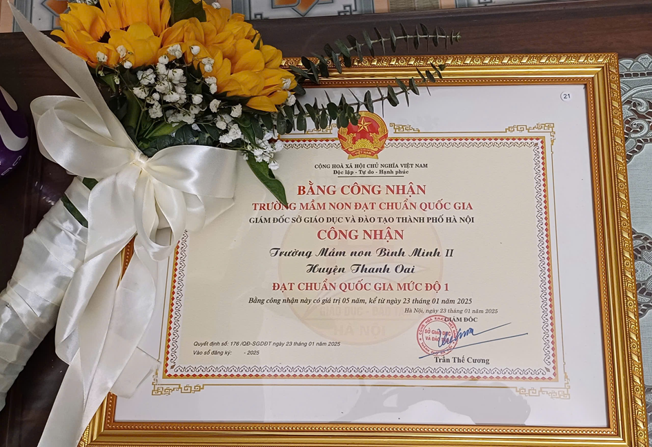 Ngày 04/4/2025, trong không khí hân hoan và đầy tự hào Trường Mầm non Bình Minh, Huyện Thanh Oai rất vinh dự được tham dự Lễ đón nhận Bằng công nhận Trường đạt chuẩn quốc gia mức độ 1 do Sở Giáo dục và Đào tạo thành phố Hà Nội trao tặng theo quyết định số 176 ngày 23/01/2025 của Sở Giáo dục và Đào tạo. Đây là dấu mốc quan trọng, ghi nhận những nỗ lực không ngừng của tập thể cán bộ, giáo viên, nhân viên nhà trường trong việc nâng cao chất lượng chăm sóc, nuôi dưỡng và giáo dục trẻ. Việc đạt chuẩn quốc gia là minh chứng cho sự phát triển toàn diện cả về cơ sở vật chất, đội ngũ giáo viên, chương trình giảng dạy và công tác quản lý nhà trường. Phát biểu tại buổi lễ, đại diện lãnh đạo Sở Giáo dục và Đào tạo Hà Nội ghi nhận và biểu dương sự cố gắng, tinh thần đoàn kết của tập thể của các nhà trường. Đồng thời bày tỏ mong muốn các nhà trường tiếp tục phát huy thành tích đạt được, đổi mới phương pháp giáo dục, xây dựng môi trường học tập thân thiện, an toàn, lấy trẻ làm trung tâm. Thành công này có được là nhờ sự quan tâm chỉ đạo của các cấp lãnh đạo, sự hỗ trợ của chính quyền địa phương, sự đồng hành của phụ huynh học sinh và sự tâm huyết của đội ngũ cán bộ, giáo viên, nhân viên nhà trường. Với cơ sở vật chất khang trang, môi trường giáo dục Xanh- thân thiện – an toàn – hiện đại, cùng đội ngũ giáo viên tận tâm, sáng tạo và yêu nghề, nhà trường luôn nỗ lực không ngừng để mang đến những điều tốt đẹp nhất cho trẻ thơ – những mầm non tương lai của đất nước. Trường Mầm non Bình Minh II sẽ tiếp tục nỗ lực không ngừng để giữ vững và nâng cao hơn nữa chất lượng giáo dục, xứng đáng với niềm tin yêu của phụ huynh và cộng đồng. Sau đây là một số hình ảnh: